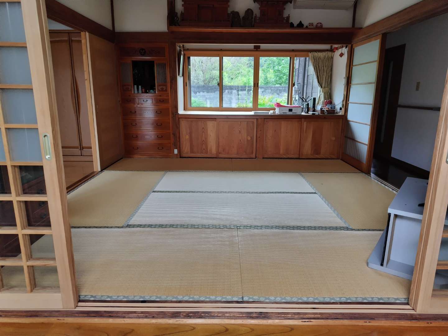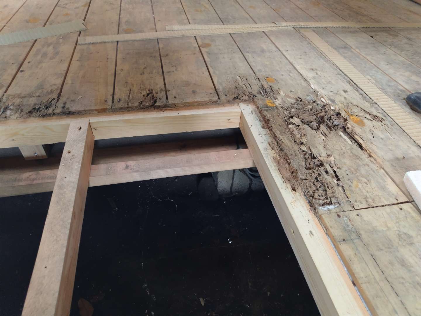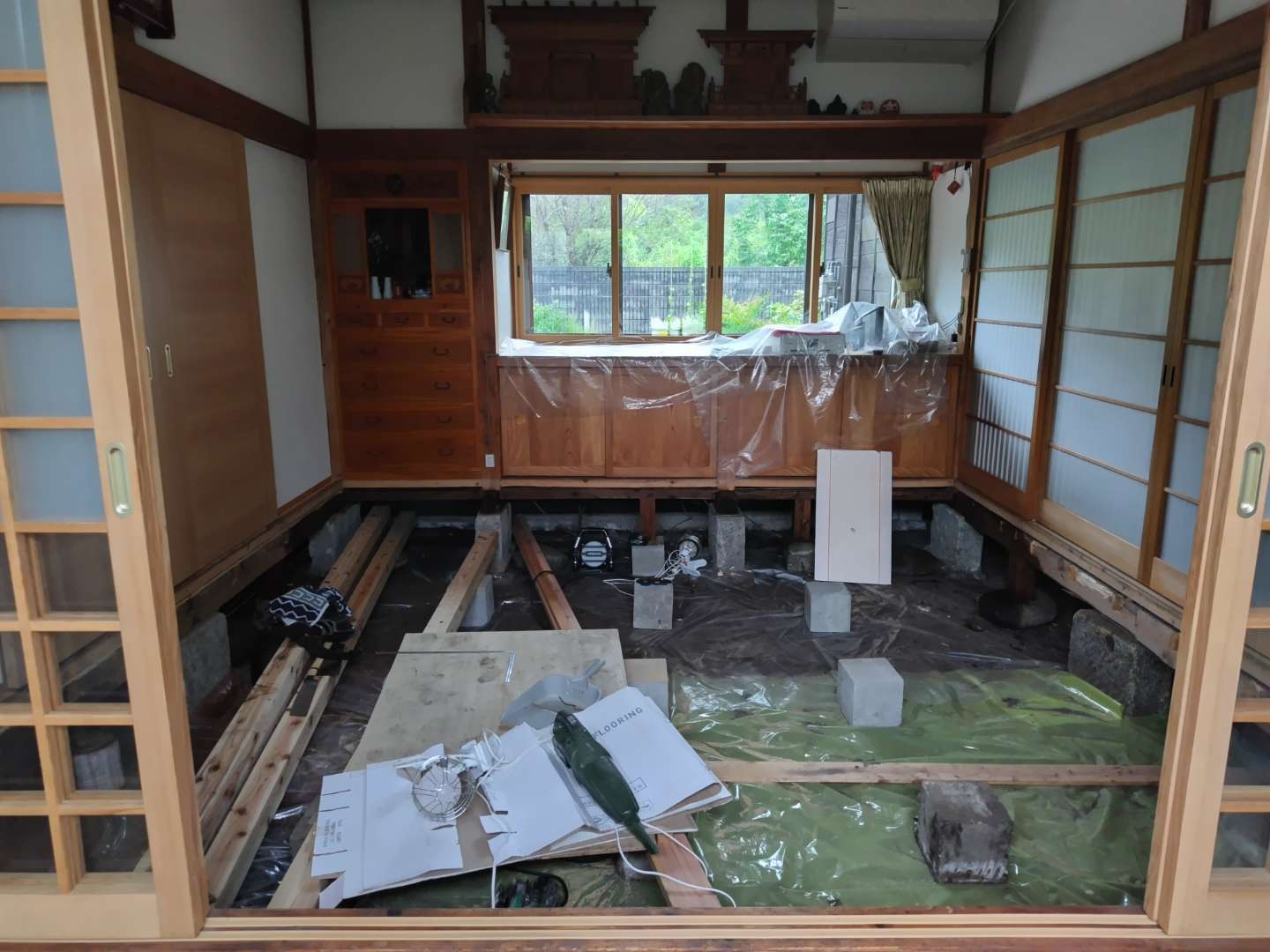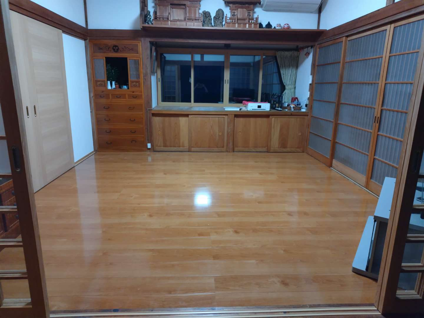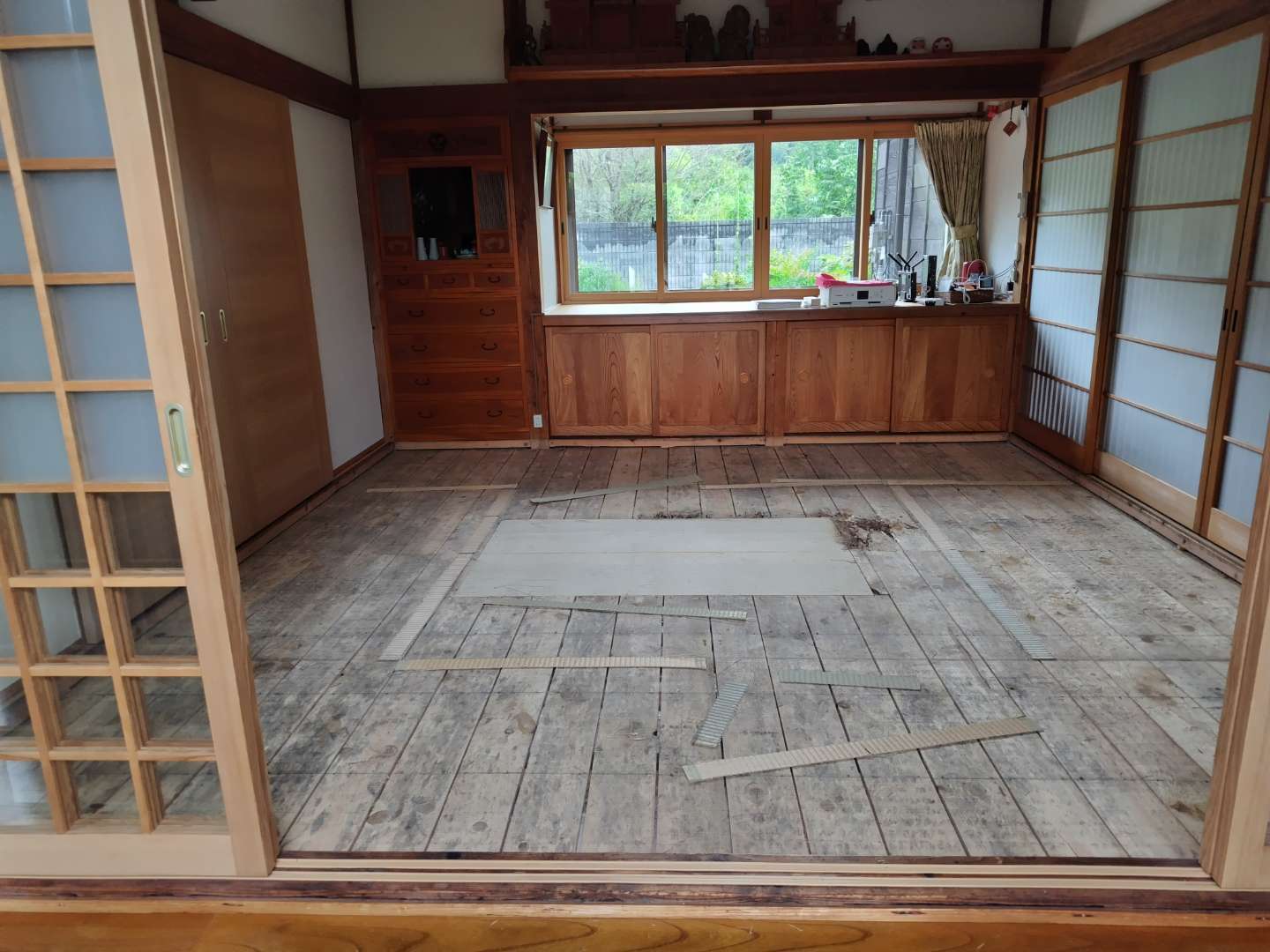こちらは、掘りごたつの炉縁(ろぶち)廻りの床下地にシロアリが入り急遽改修工事となった案件で、床下地の他にも畳中にシロアリが侵入していたため、床全面を撤去し、下地から作り直し、使いやすくするという観点から板張りとしました。